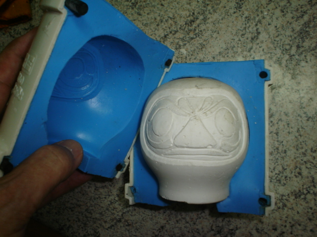 4 - Moldagem dos Dharmas. Diariamente era confeccionado um lote de Dharmas em gesso. O gesso era misturado com água e vertido no molde e aplicada uma vibração: