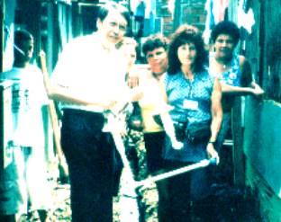 Flagrante em que o engo Roberto Massaru Watanabe dá explicações técnicas a moradoras da Favela Tolstoi, durante Mutirão Comunitário de Ligação Domiciliar de Água, promovido pela Comissão de Serviços à Comunidade, presidida pelo companheiro Gilson Almeida Barreto.