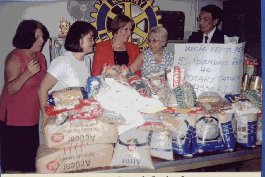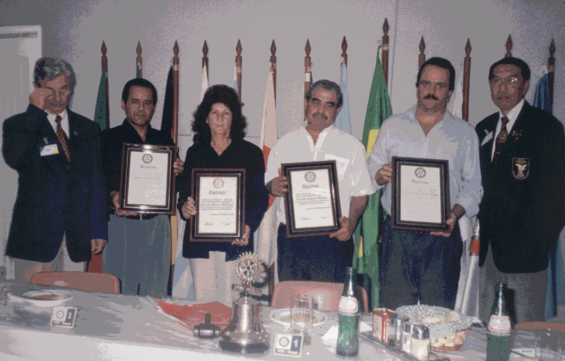 VOLUNTÁRIOS RECEBEM HOMENAGEM EM REUNIÃO SERVIÇOS À COMUNIDADE Este posto, tocado por voluntários, visa o atendimento de pessoas físicas e jurídicas sobre qualquer questão. Desde orientação para a obtenção de documentos pessoais, de inscrição de entidades em órgãos dos governos, como para obtenção regular de cestas básicas, encaminhamento de doentes para cirurgias, regularização de documentos legais de entidades comunItárias e outros atendimentos. Os voluntários que trabalharam no Posto de Orientação Comunitárias foram homenageados como Voluntários do Rotary em reunião ordinária do clube (VEJA FOTO ACIMA). SERVIÇOS INTERNACIONAIS O Programa Intercâmbio Internacional de Jovens teve um destaque especial neste ano. Tivemos 2 Jovens que foram para outros países, sendo Thiago Feliciano da Silva para Holanda e Juliana Cardoso de Matos para a cidade de Lions nos Estados Unidos.(intercâmbios de curta duração) Em contrapartida, recebemos a jovem Kathelyn Higgins dos Estados Unidos e Takako Okamura do Japão. (intercâmbios de longa duração)Recebemos também a delegação dos EUA do Intercâmbio de Grupo de Estudos. Tivemos o cuidado de preparar uma reunião especial em homenagem a eles. Colocamos a Bandeira dos EUA ao lado da Bandeira Nacional e, na abertura da reunião, solicitamos uma saudação à Bandeira Brasileira e também à Bandeira dos EUA. (isso foi feito em inglês). Aproveitamos e conduzimos a maior parte da reunião em inglês. Ao final, todos os integrantes da equipe do IGE receberam das mãos do Presidente Roberto Massaru Watanbe, um exemplar do Dharma.